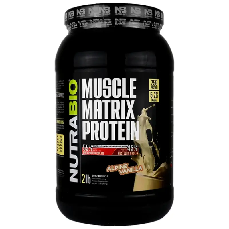 پودر پروتئین ماسل ماتریکس نوترابایو طعم وانیل آلپاین907 گرمی Muscle Matrix Protein Nutra Bio-907 g