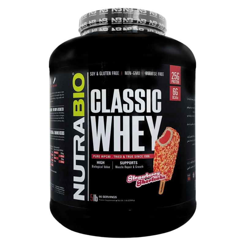 پودر پروتئین وی کلاسیک نوترابایو طعم کیک توت فرنگی 2268 گرمی Nutra Bio Classic Whey Powder 2268g