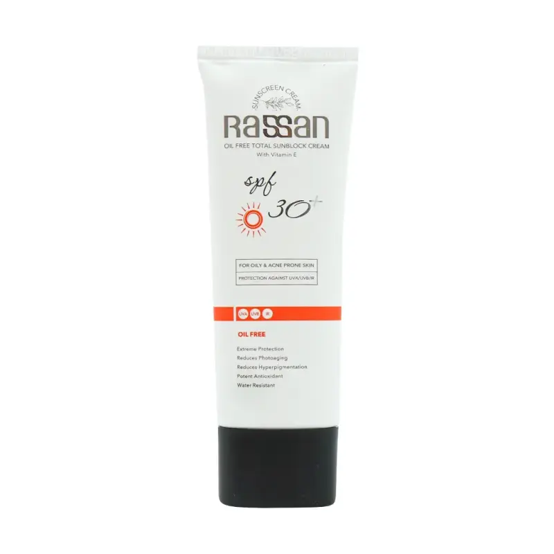 کرم ضد آفتاب فاقد چربی SPF30 راسن مناسب پوست چرب و آکنه دار ۵۰ میلی لیتر Rassan Oil Free Total Sunblock Cream SPF30 50 ml