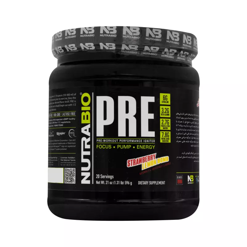 پودرپمپ پری ورک آوت نوترابایو طعم بمب لیمو توت فرنگی 596 گرمی Pre Workout Nutra Bio-596g